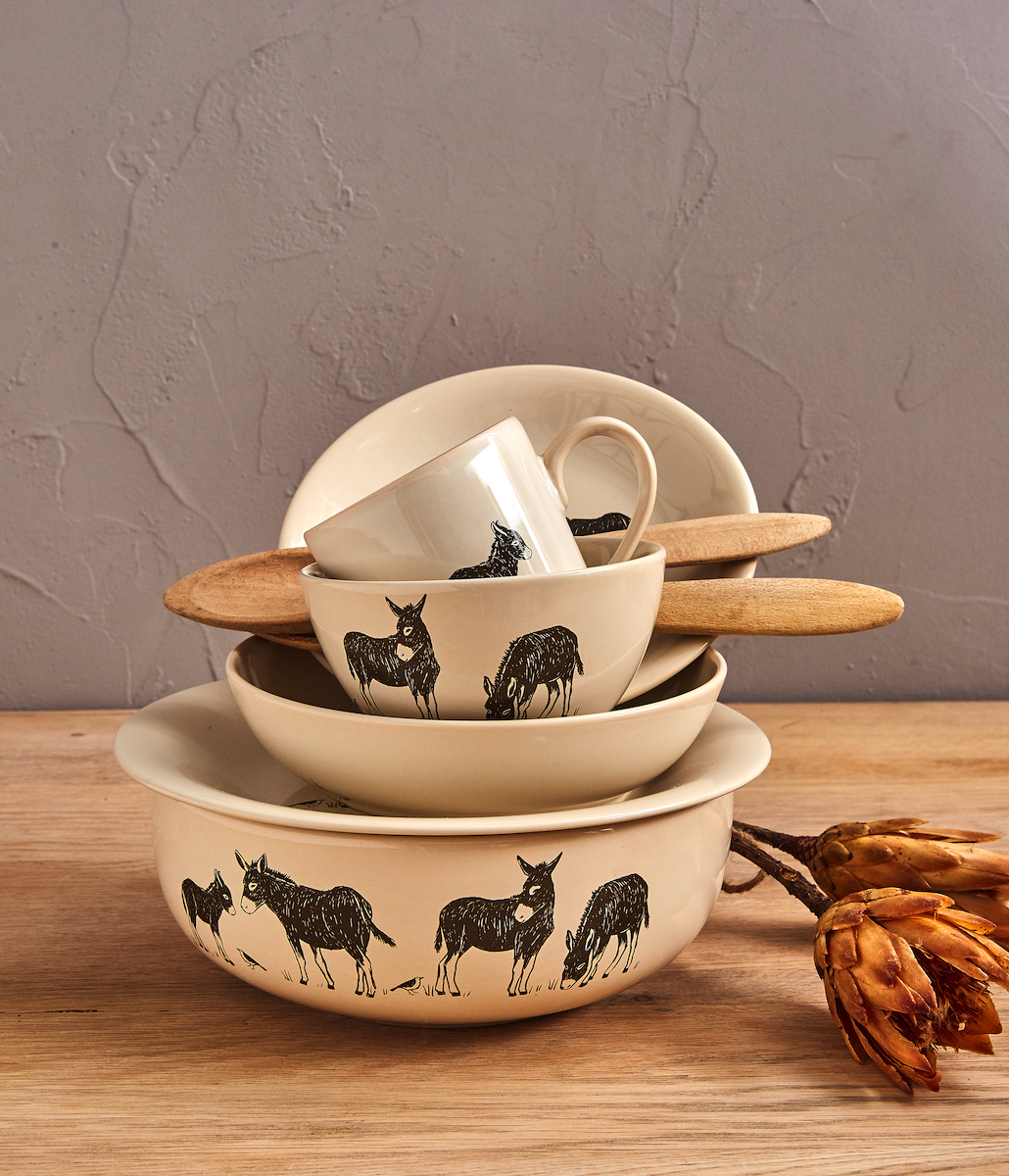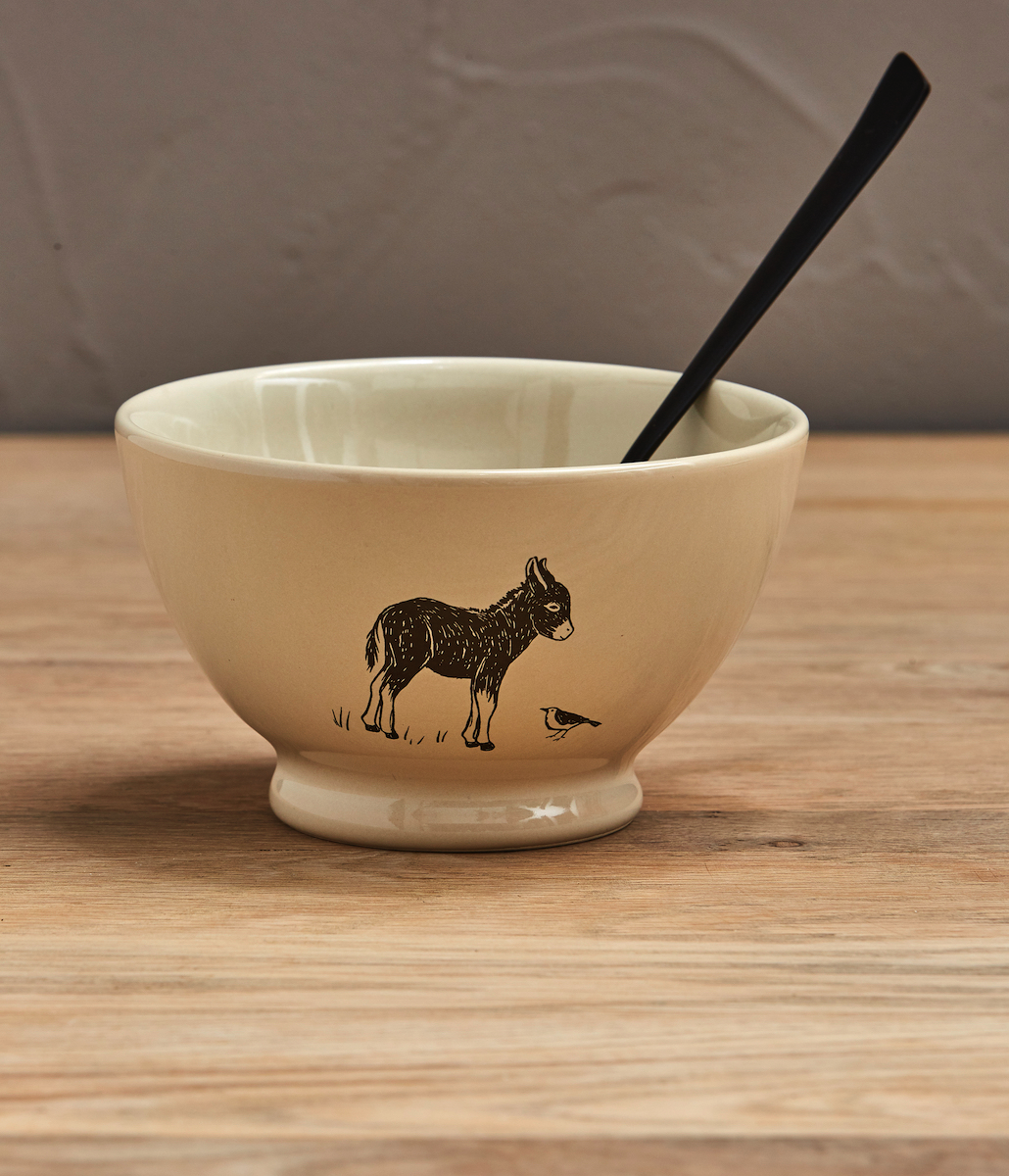 Notre fidèle compagnon de route dessiné dans un style gravure contemporaine apporte une déco authentique et nature à ces bols à talon d’un diamètre de 14cm, couleur lait d’ânesse.