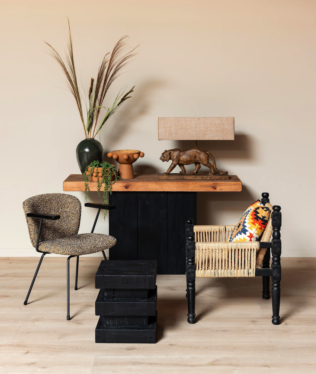 Cette pièce remarquable se distingue par son plateau en pin recyclé aux nuances chaleureuses, sublimé par un piétement noir mat qui crée un contraste saisissant et résolument moderne.