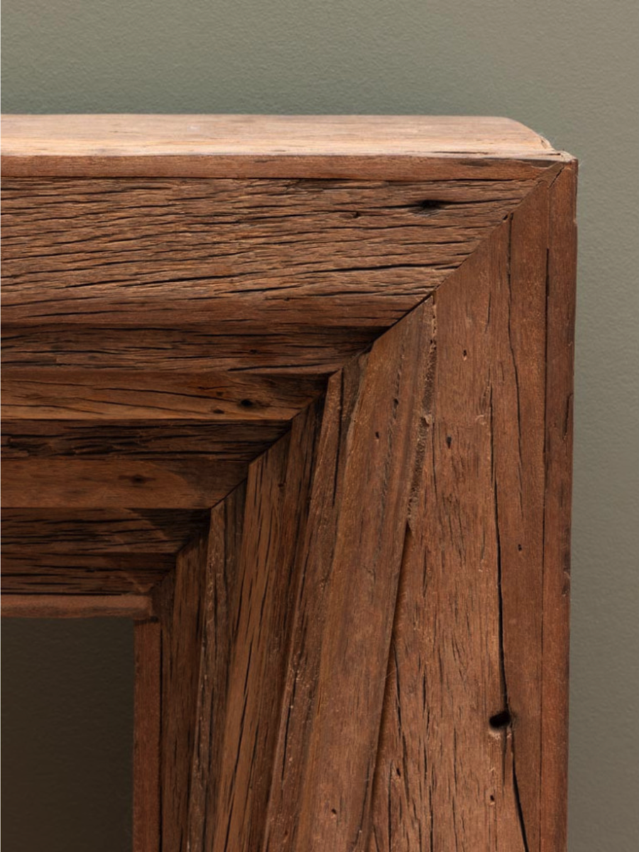 - Chaque pièce est façonnée dans du bois recyclé aux teintes naturelles chaleureuses allant du beige doré aux tons plus foncés. Les marques du temps, les fissures naturelles et les variations de couleur font de chaque console une œuvre unique et authentique.