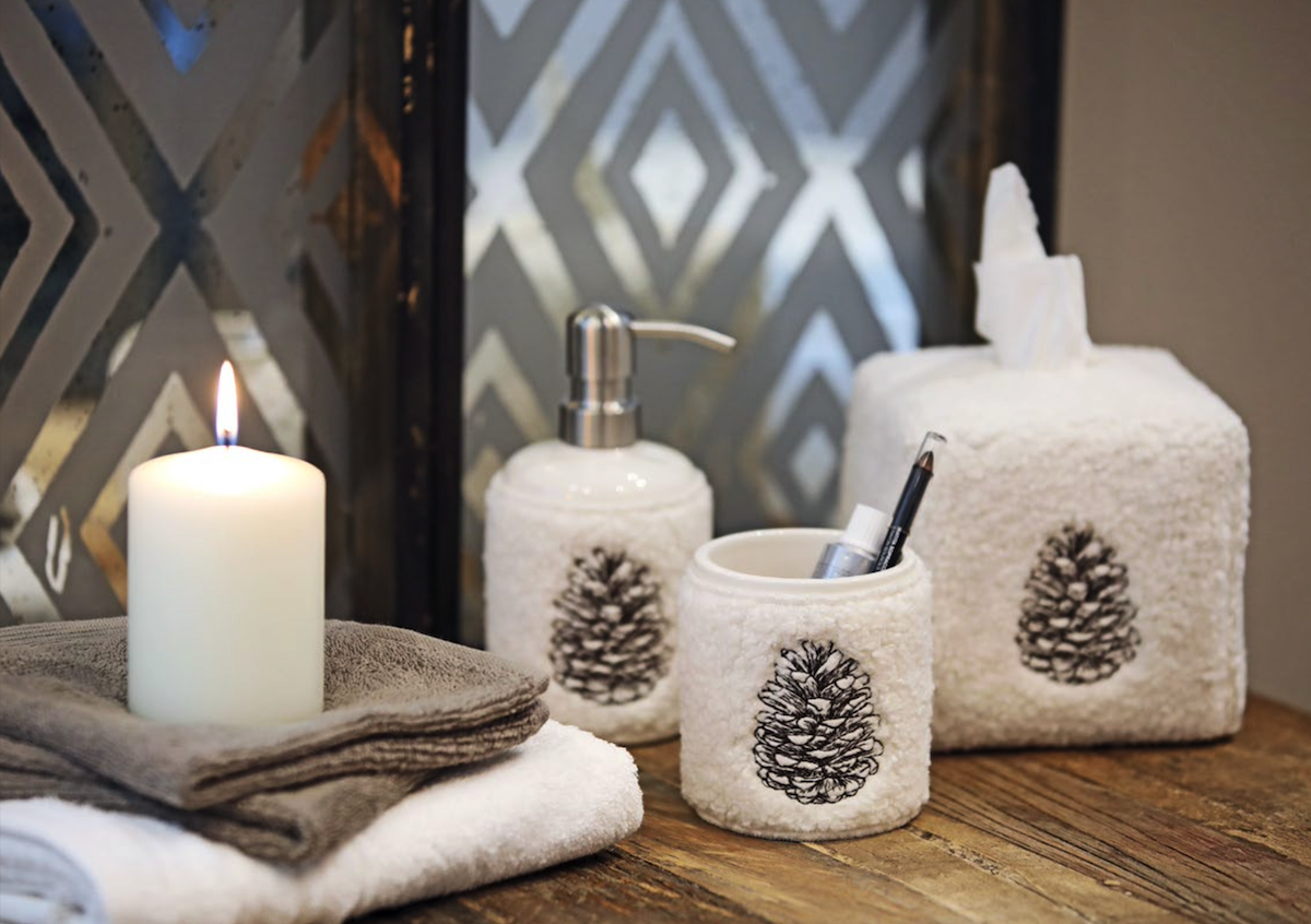 Ce distributeur est facile à assortir avec les autres articles de la collection Bouclette Pomme de pin.