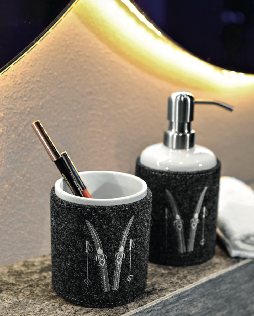 Ce distributeur de savon est recouvert d'un délicat feutre de laine fabriqué à la main en Italie avec un motif brodé de skis stylisés. Chaque pièce est fabriquée avec soin et attention aux détails, garantissant une durabilité et une qualité exceptionnelles.
