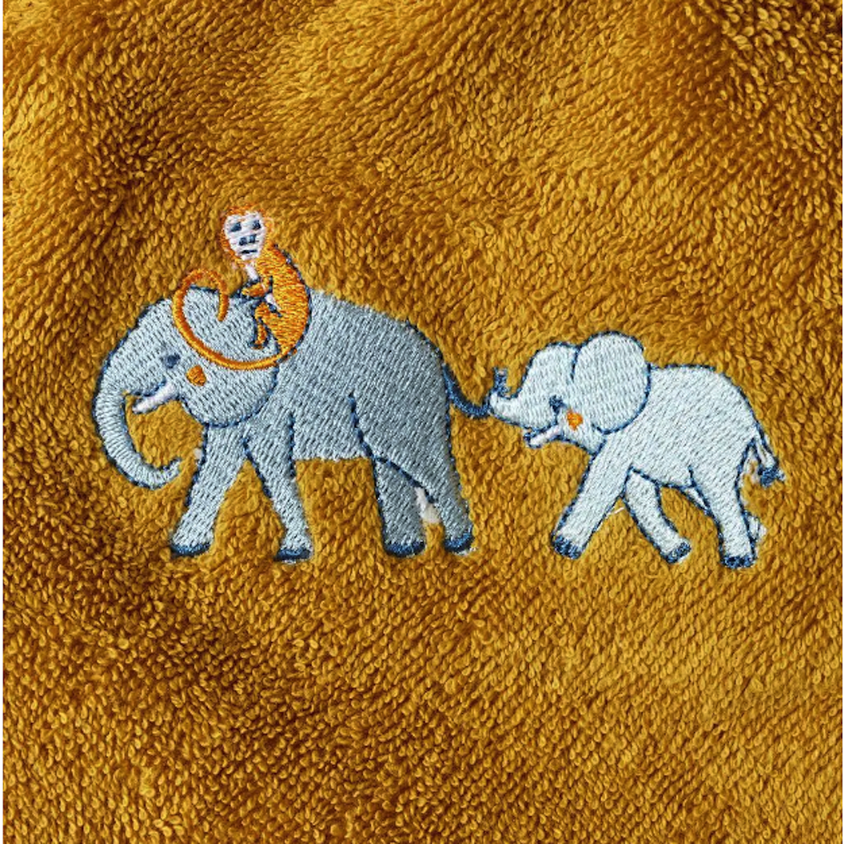 Disponible en un doux coloris safran, ce gant de toilette est ornée d'une broderie délicate d'éléphants, apportant une touche ludique et apaisante à la parure.
