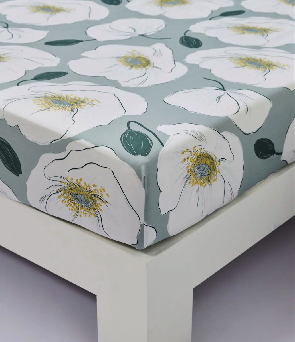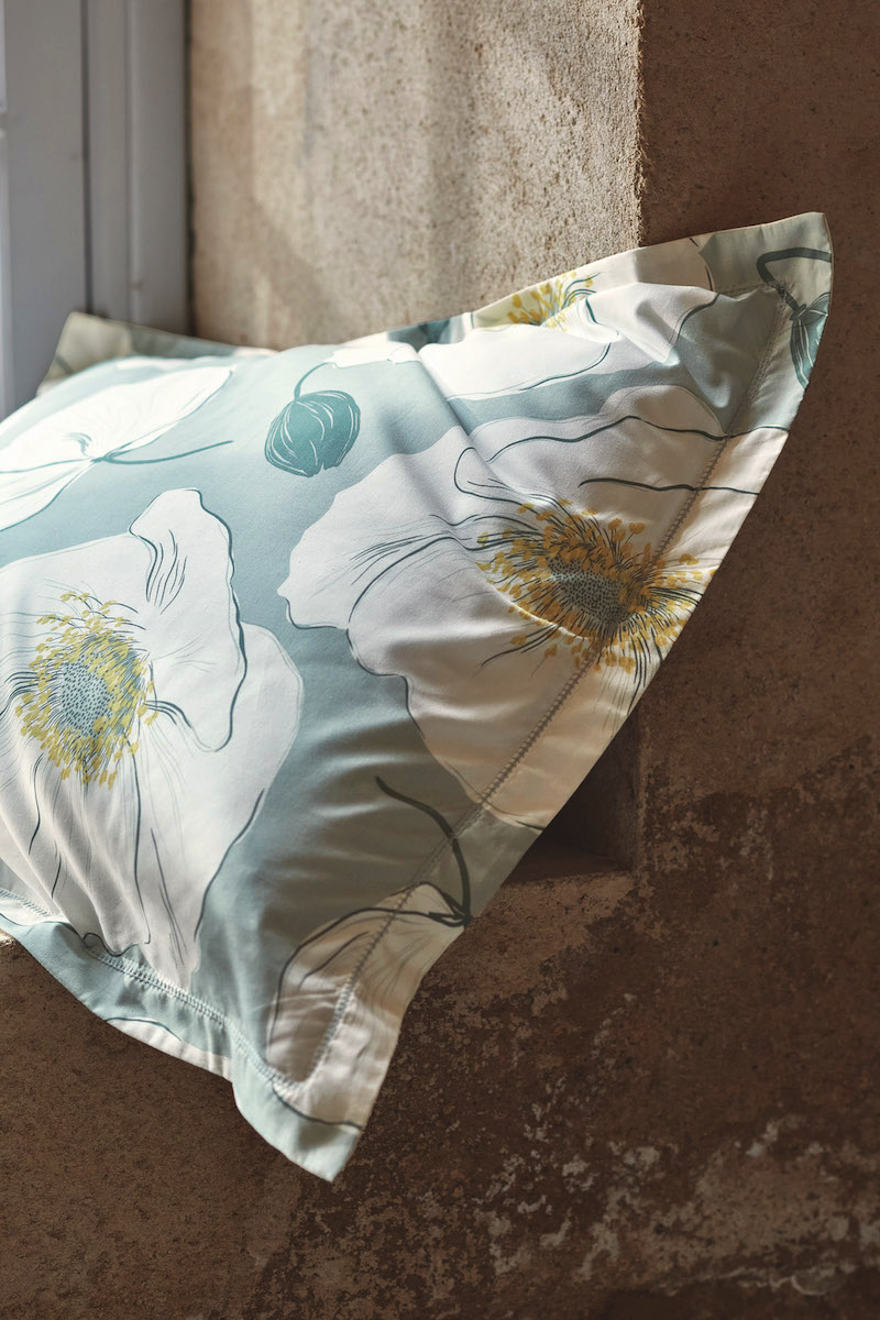 Sur une douce percale de coton des fleurs d’anémones sont imprimées dans une gamme de couleurs tendres et poétiques. Le vert céladon à la fois nature et classique s’accompagne d’un blanc cassé lumineux et frais, tandis que les pistils des fleurs déposent de fines touches de jaune paille.