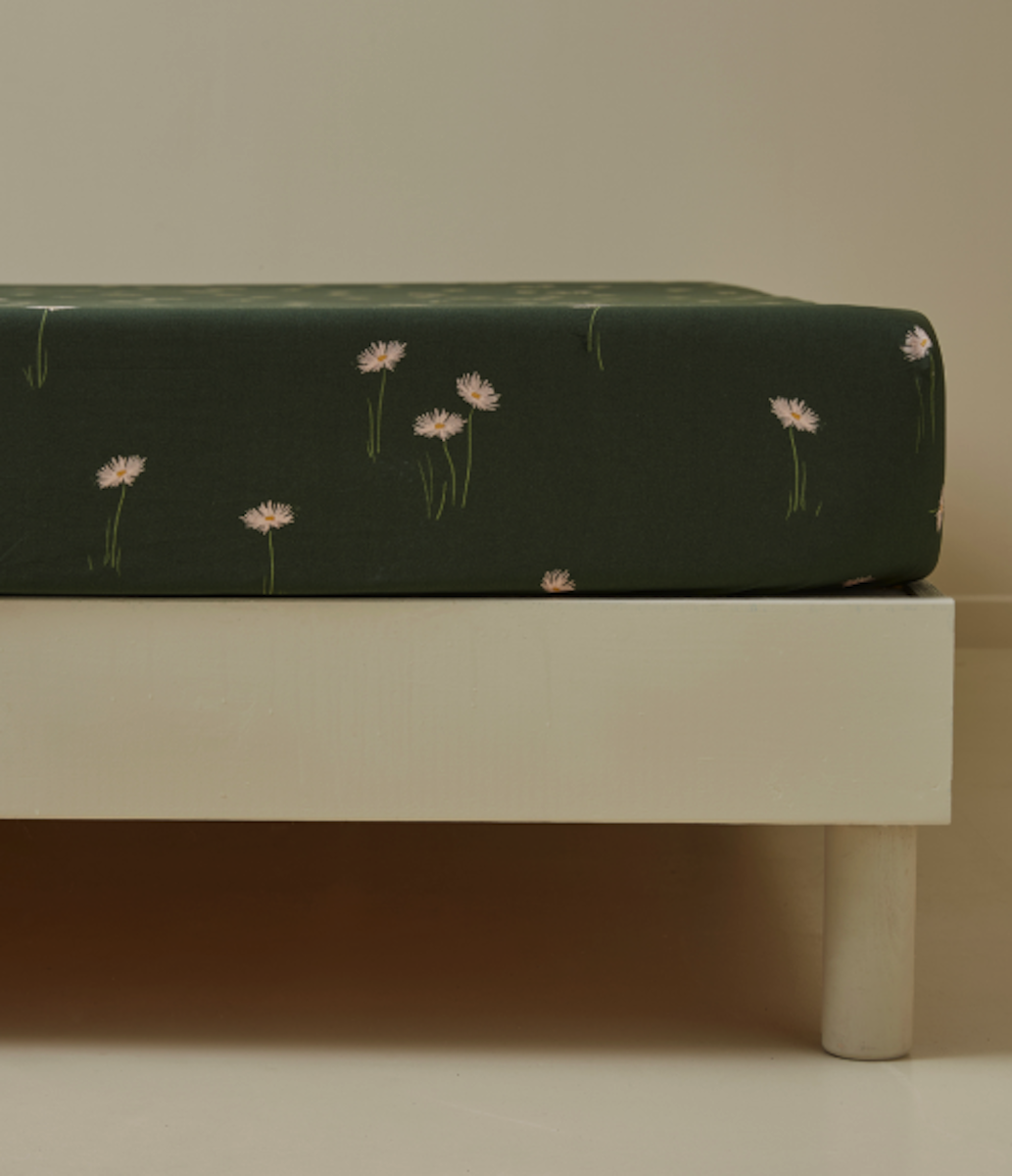 De délicates pâquerettes s’impriment avec finesse sur un fond kaki.