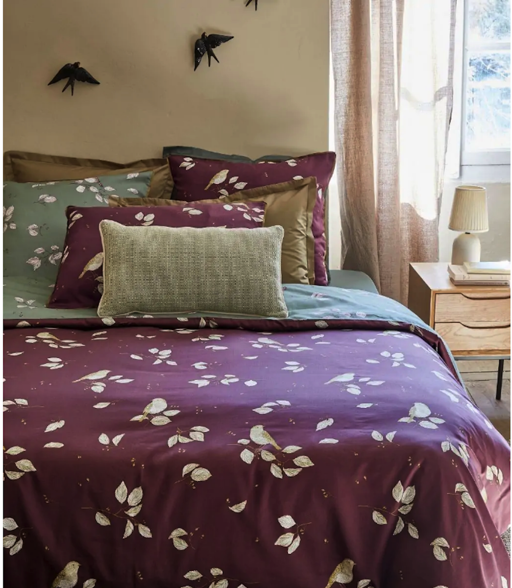 Un vert fumé côtoie un aubergine et un vert mousse pétillant pour créer une atmosphère cosy et accueillante dans votre chambre.