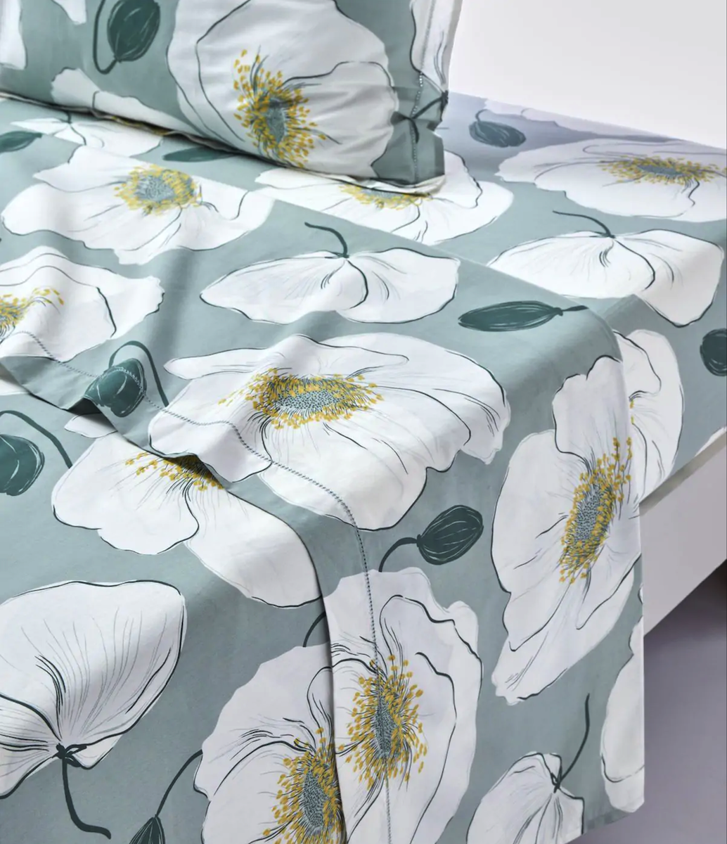 Sur une douce percale de coton des fleurs d’anémones sont imprimées dans une gamme de couleurs tendres et poétiques. Le vert céladon à la fois nature et classique s’accompagne d’un blanc cassé lumineux et frais, tandis que les pistils des fleurs déposent de fines touches de jaune paille.