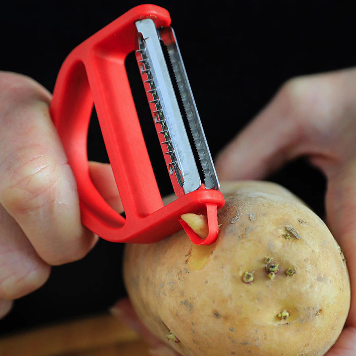 L'éplucheur T-Duo bois est équipé de deux lames recto verso, mobiles, en acier inoxydable. La première lame permet d'éplucher tous les légumes (tomates, poivron, aubergine...) grâce à sa microdenture.