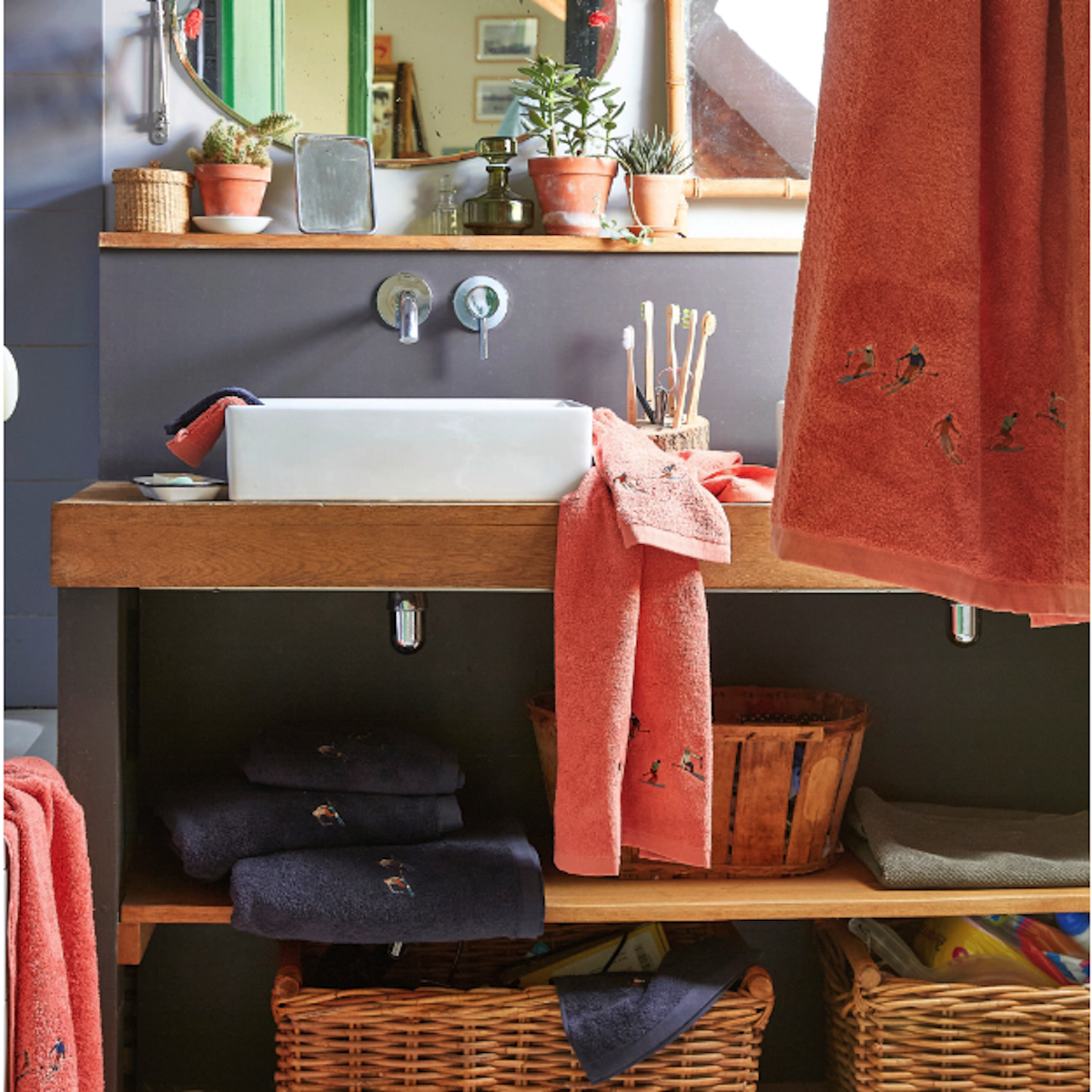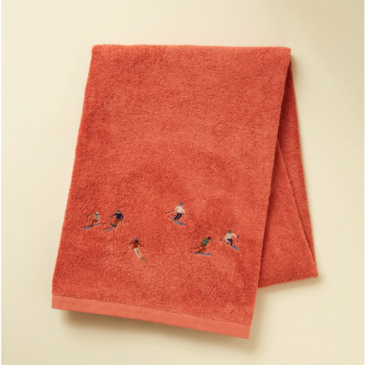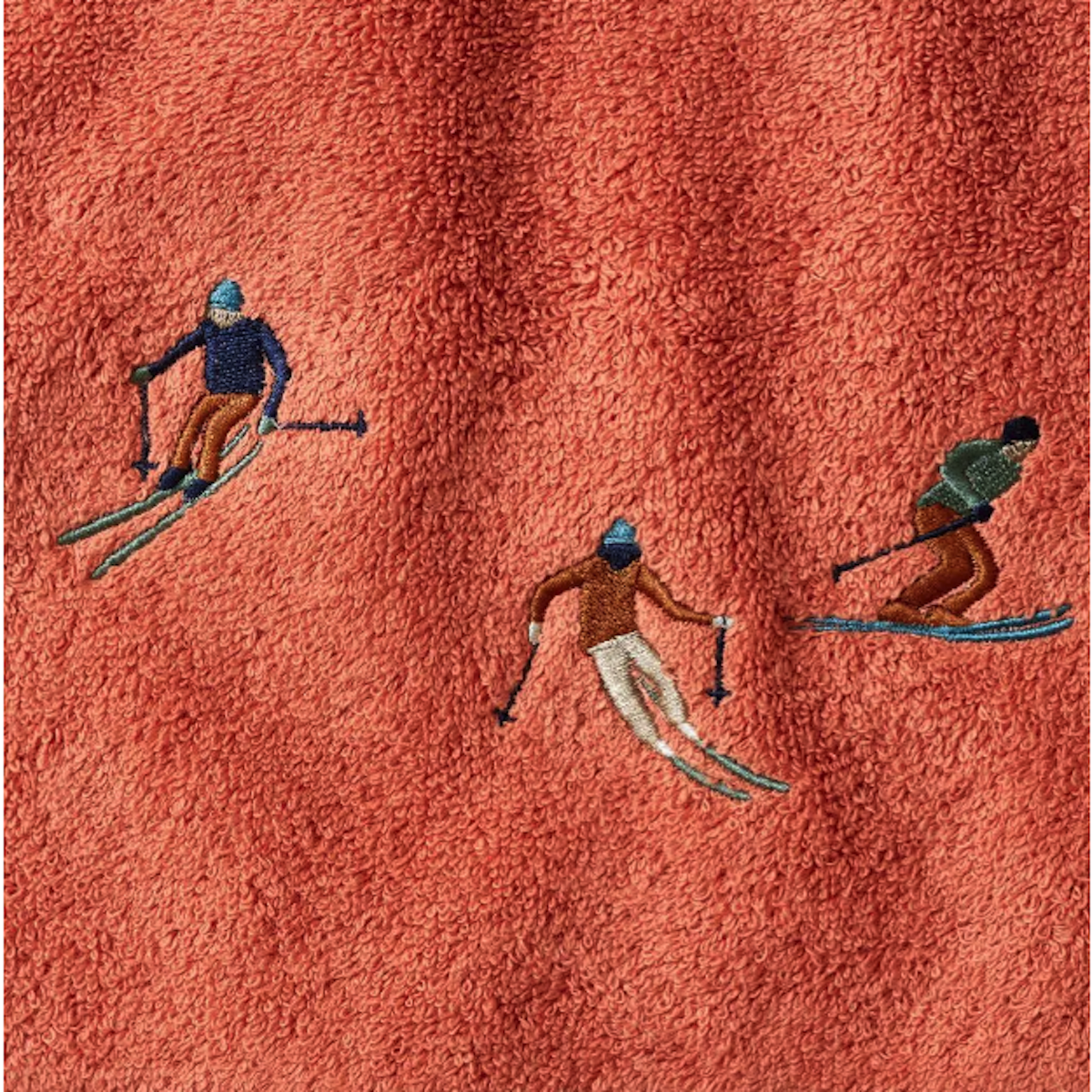 Sur les pistes, les skieurs glissent tandis que les coups de pinceaux les esquissent rapidement pour capturer leurs postures dynamiques. Ce linge de bain audacieux et moderne apportera une touche unique à votre salle de bain.