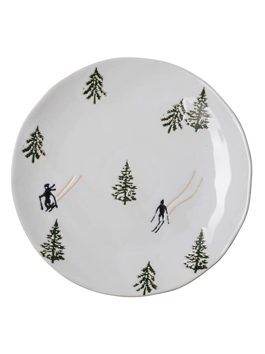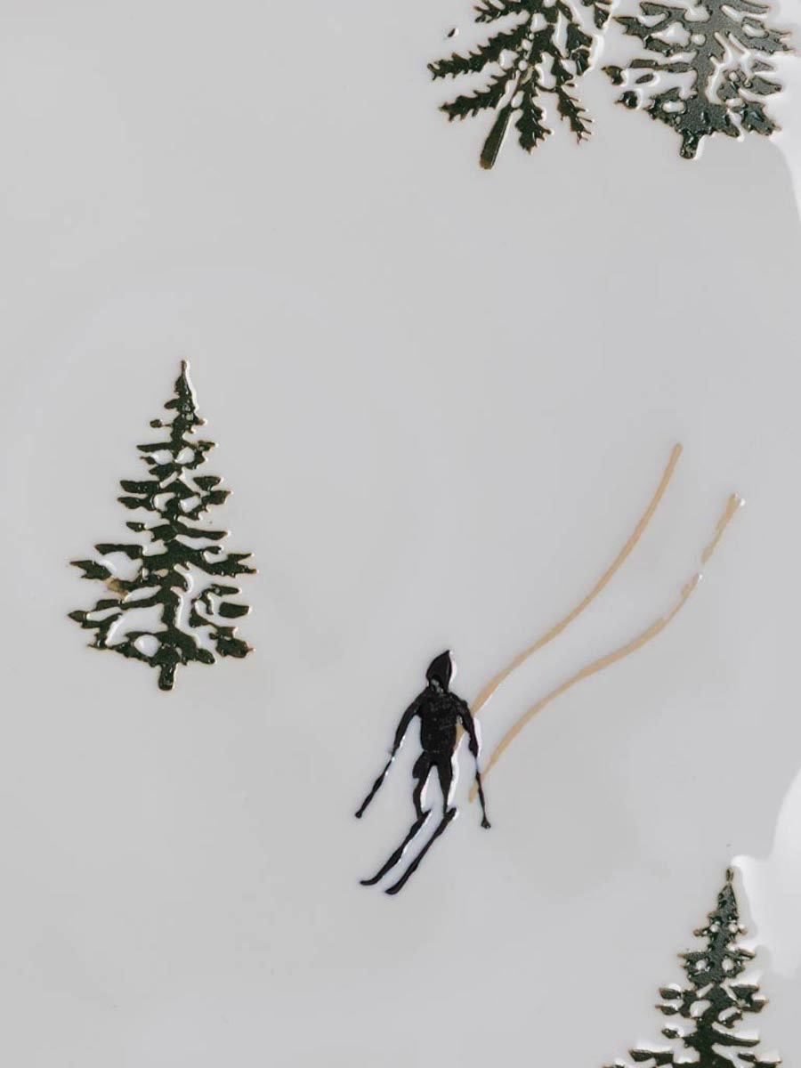 Ornée de motifs en relief représentant des skieurs en pleine descente évoluant parmi les sapins, cette pièce apporte une touche dynamique et authentique à votre table.
