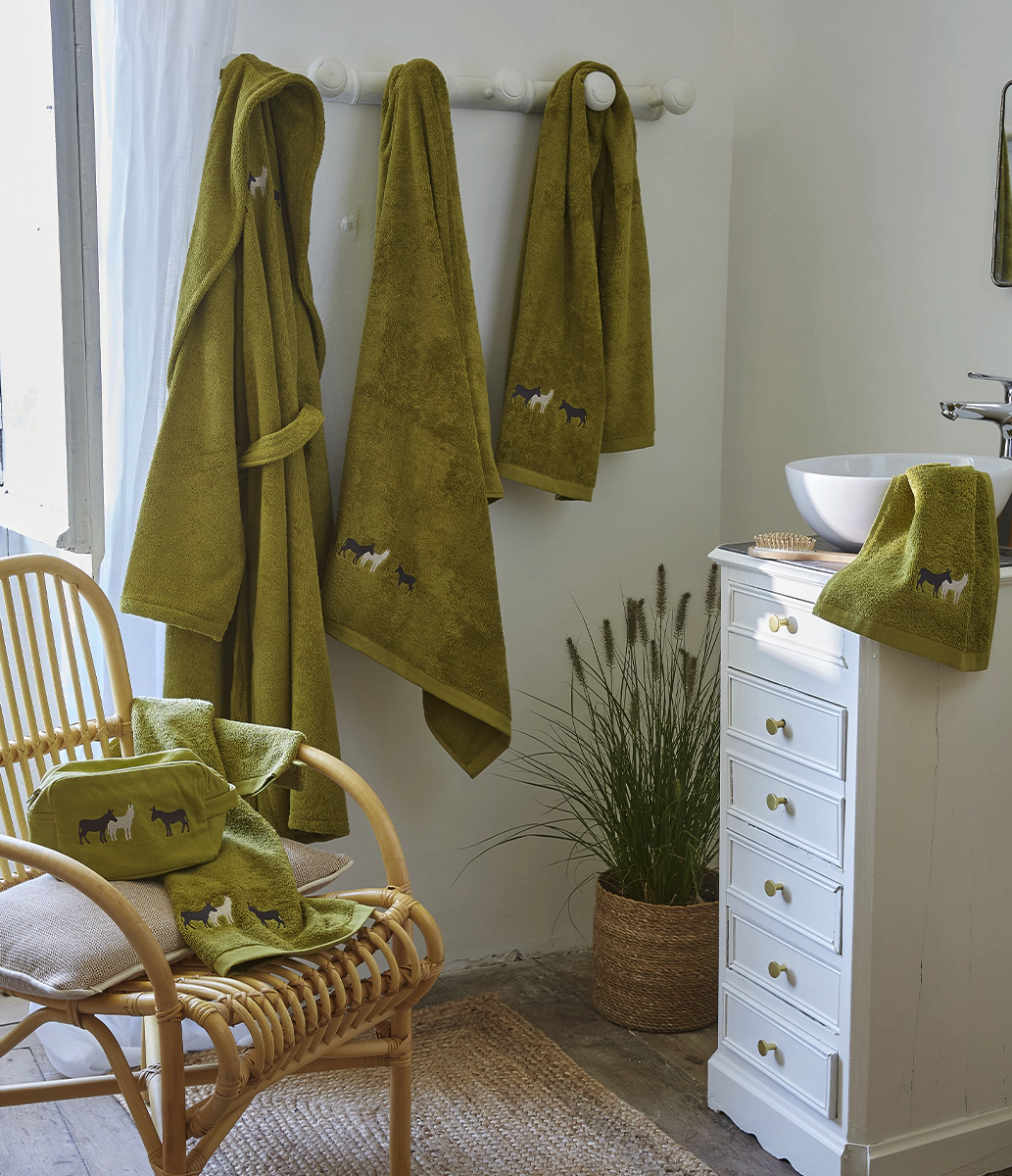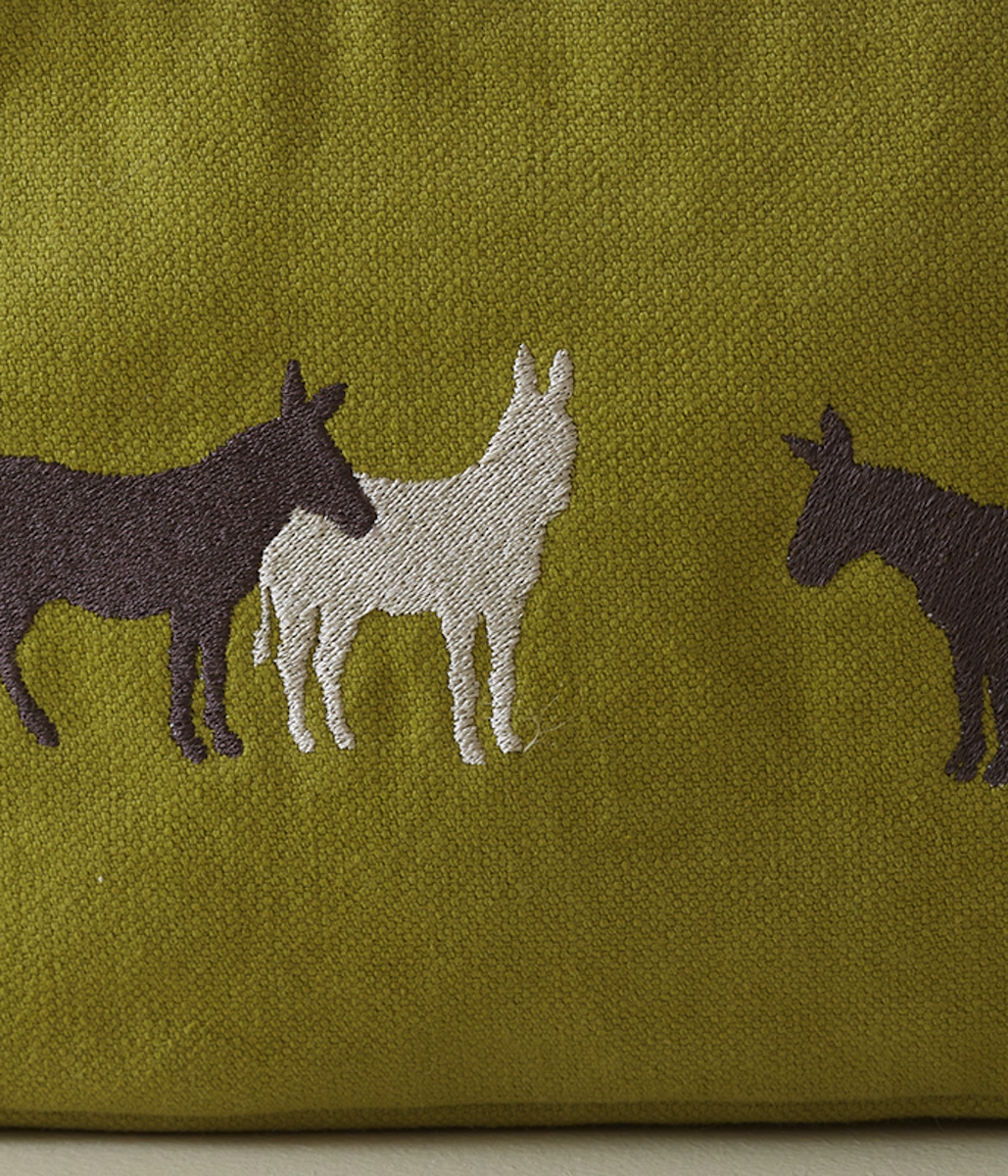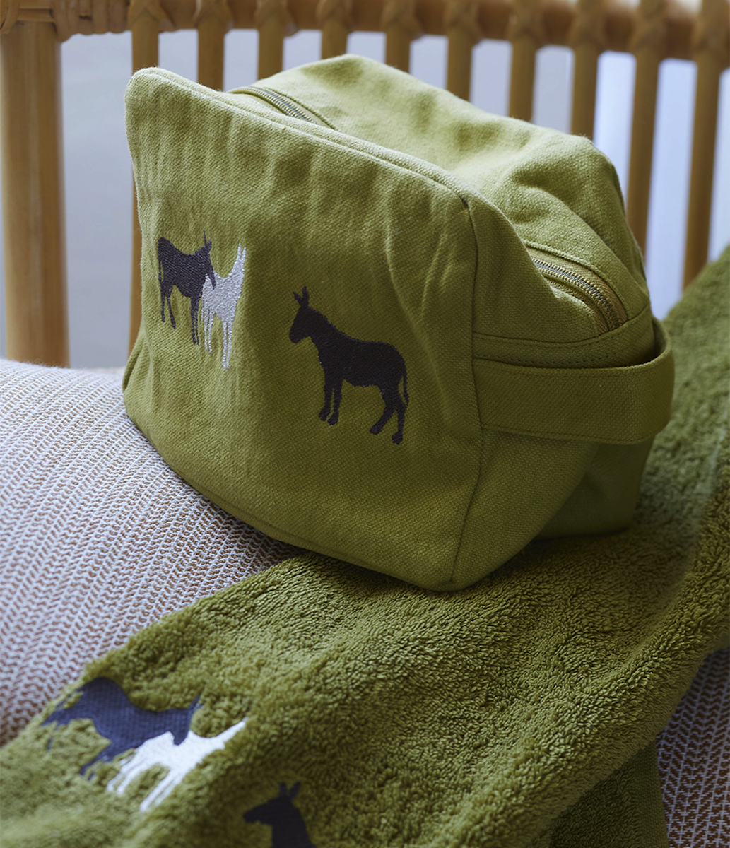 Ornée de délicates broderies d’ânes noirs et beiges, elle évoque l’authenticité et la sérénité des balades à travers la campagne.