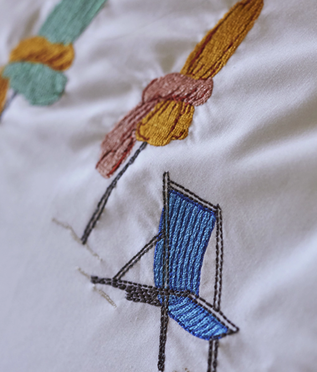 Avec toutes ses couleurs, parasols et chiliennes installent un décor au charme estival, évoquant le plaisir des siestes sous le parasol au son apaisant des vagues.