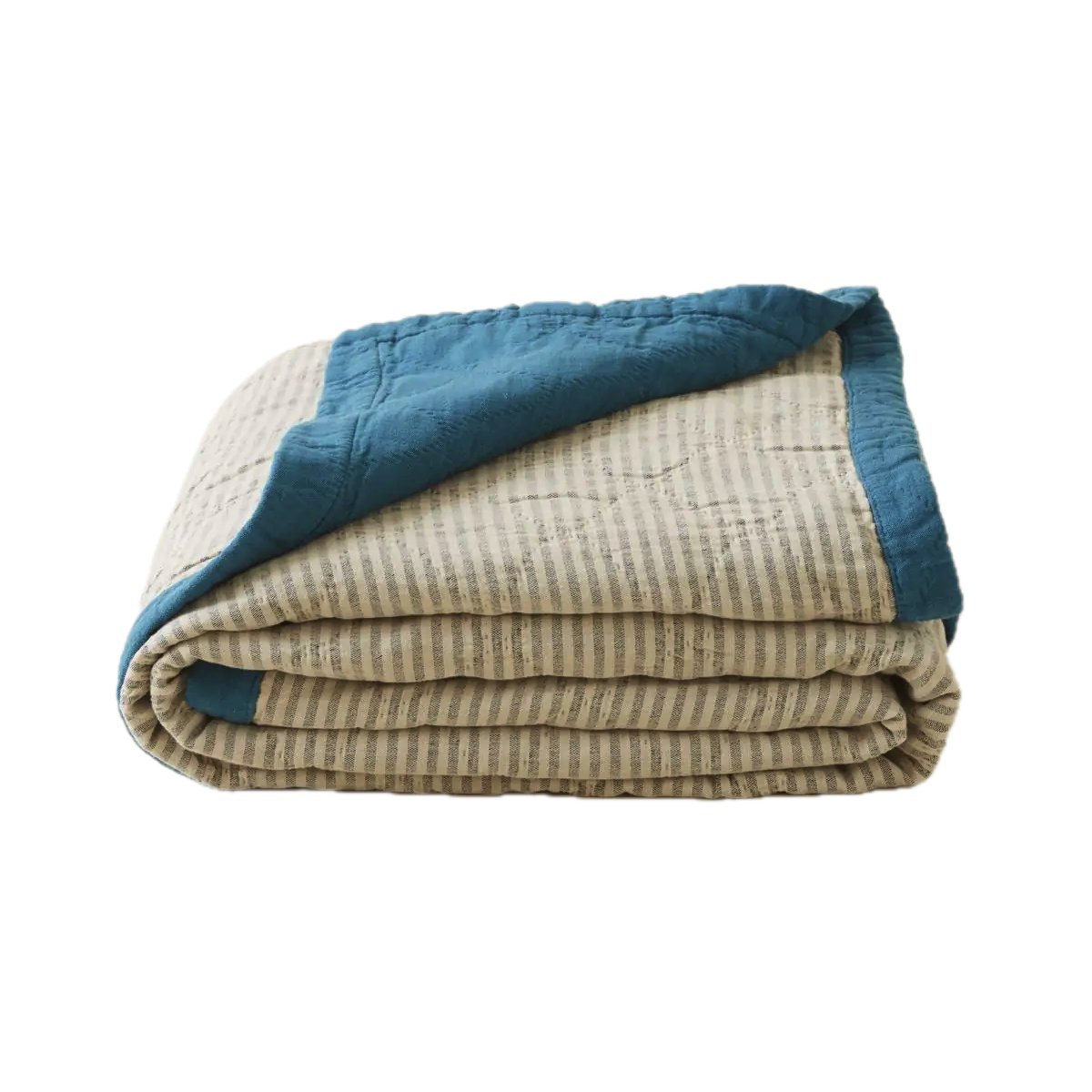 Jeté de lit 130x170 cm en coton tissé-teint rayé gris et beige épautre réversible en coton coloris vert lagon.