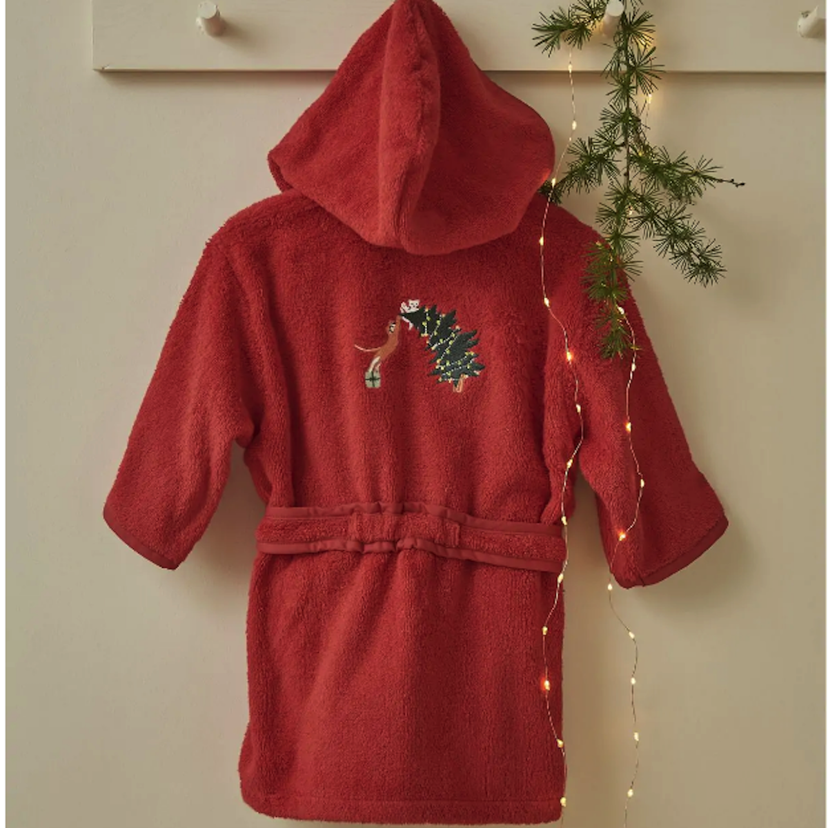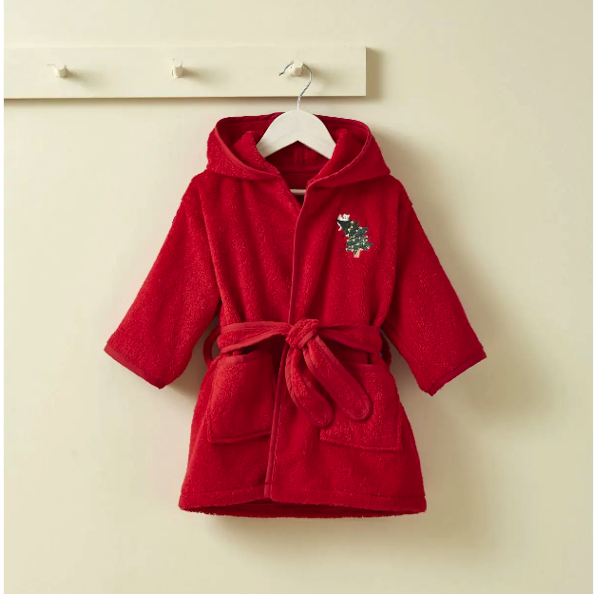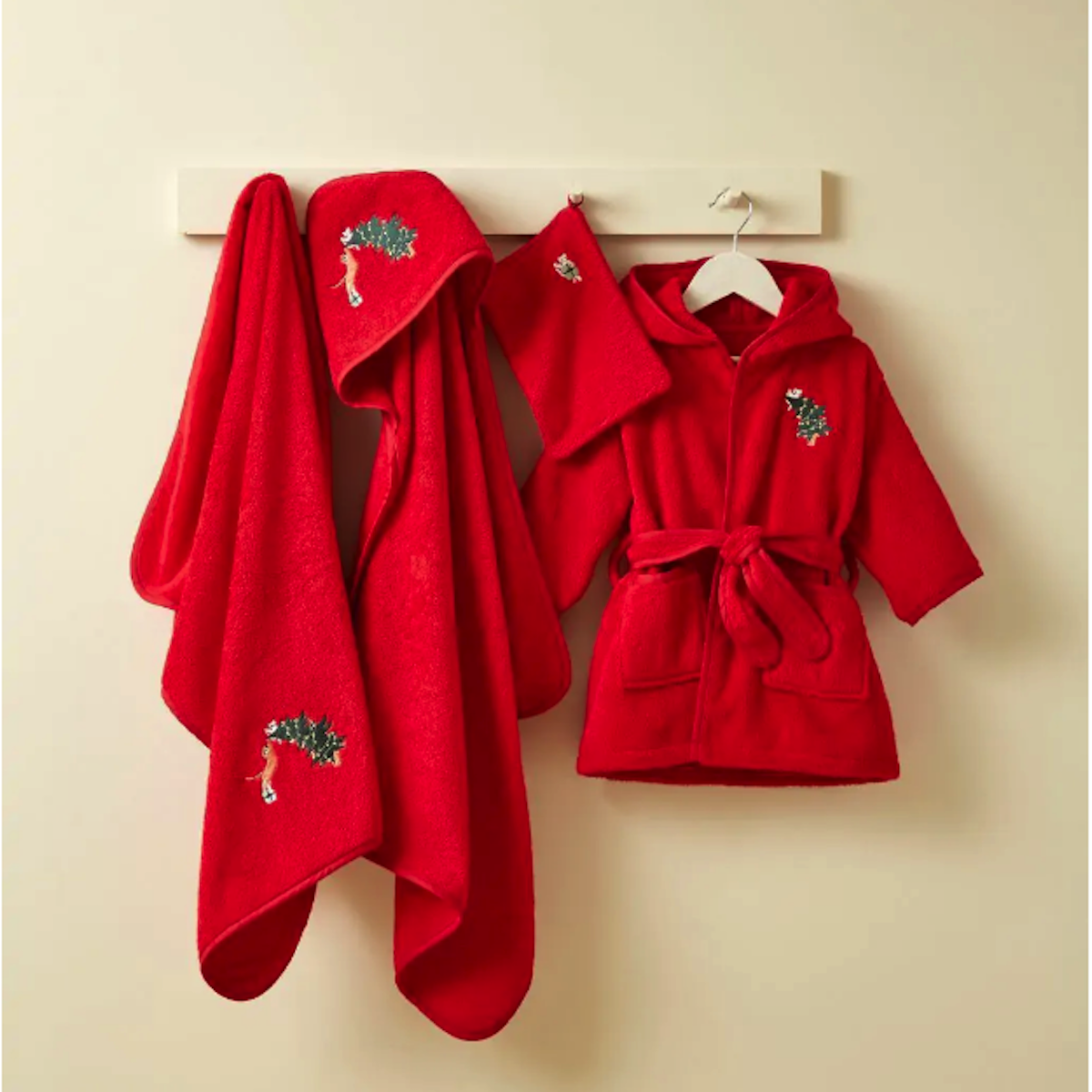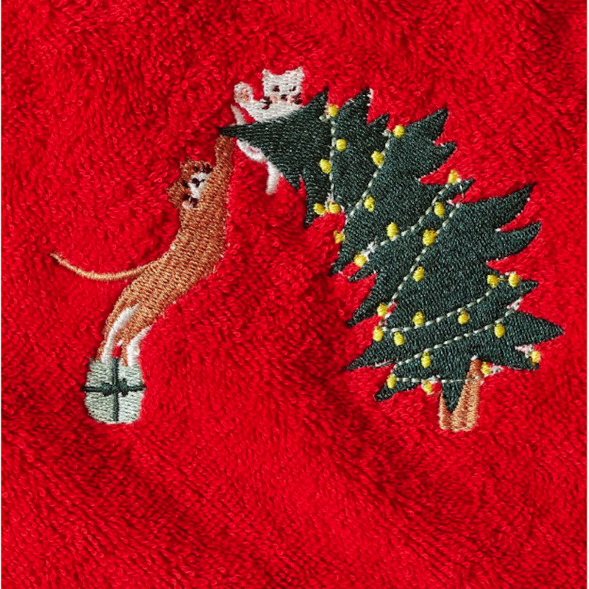 Disponible en un doux coloris rouge, chaque pièce est ornée d'une broderie délicate de chat et de sapin, apportant une touche ludique et festive à la parure.