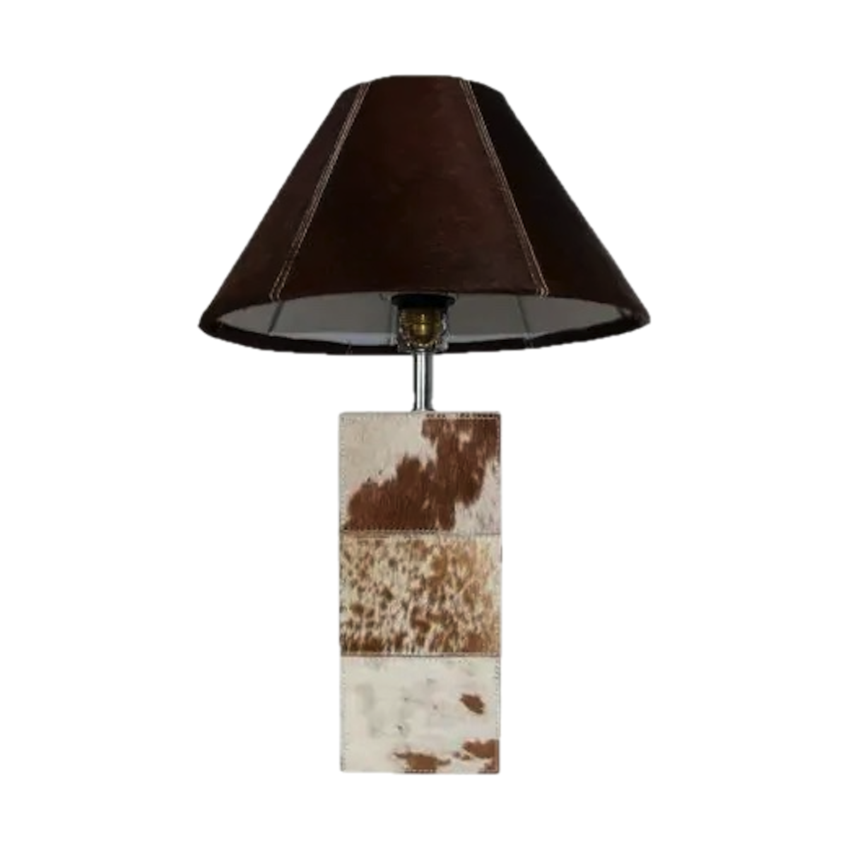 Apportez authenticité et chaleur à votre décoration avec cette base de lampe carrée habillée de peau de vache marron et blanche. Sa finition naturelle et ses lignes sobres en font une pièce élégante et pleine de caractère.