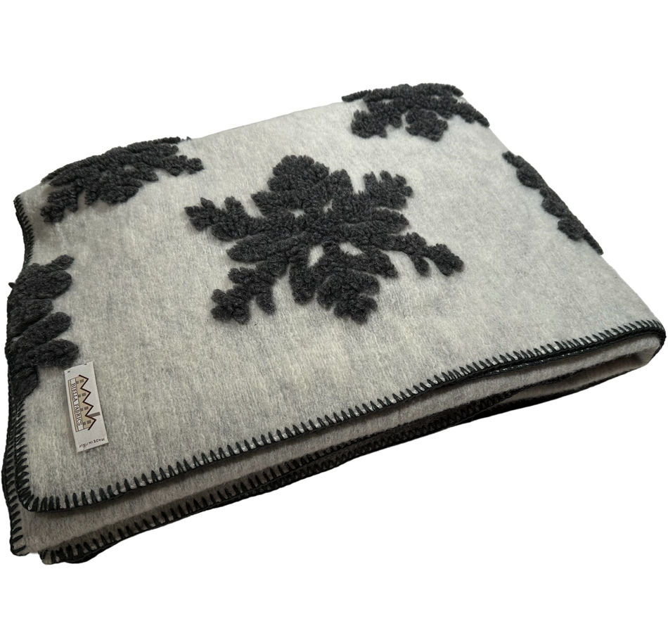 Reposez-vous dans votre canapé ou votre fauteuil préféré avec ce plaid en laine blanc et flocons gris.