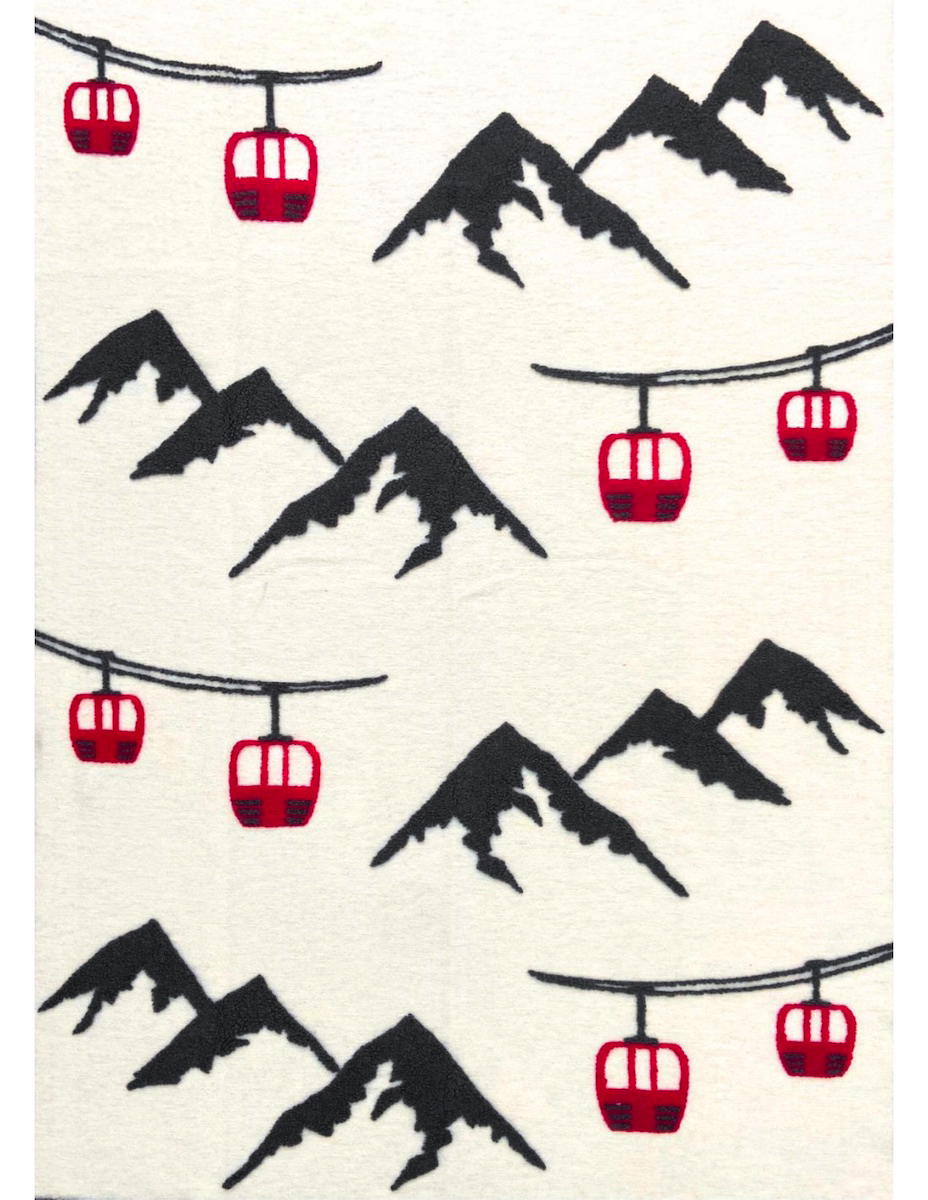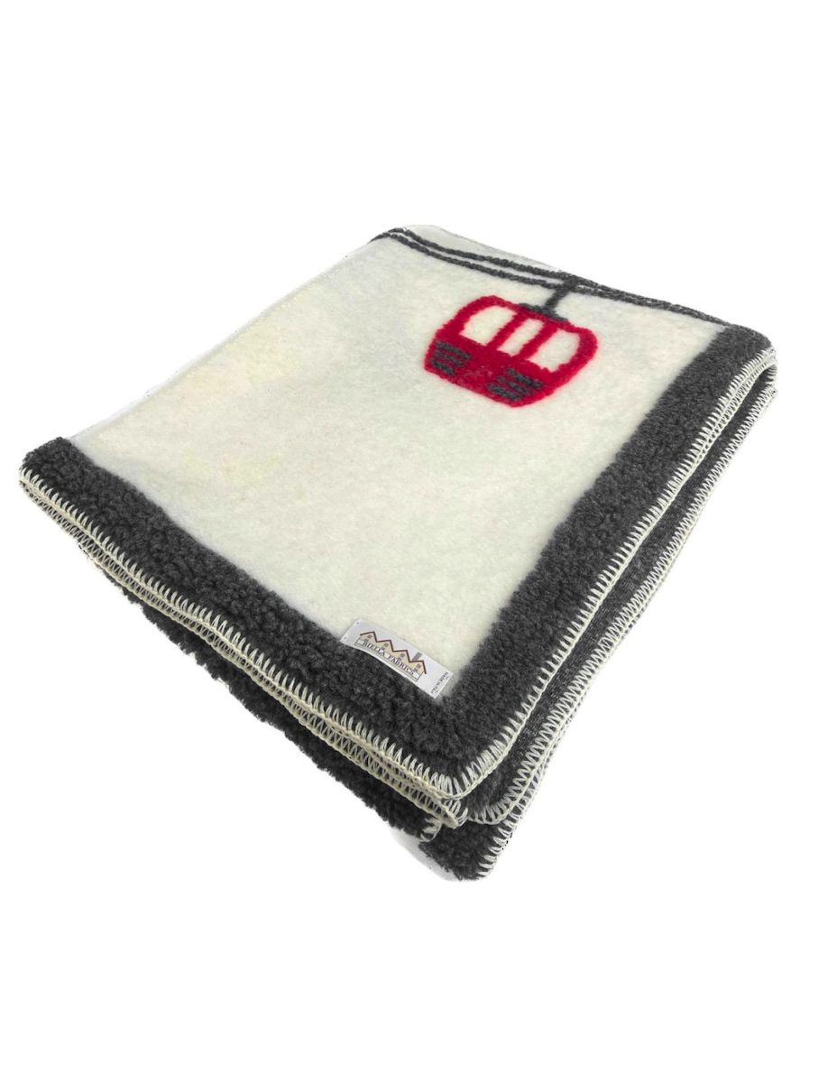 Plaid en laine blanc - Télécabines rouge/Montagnes grises 145x200