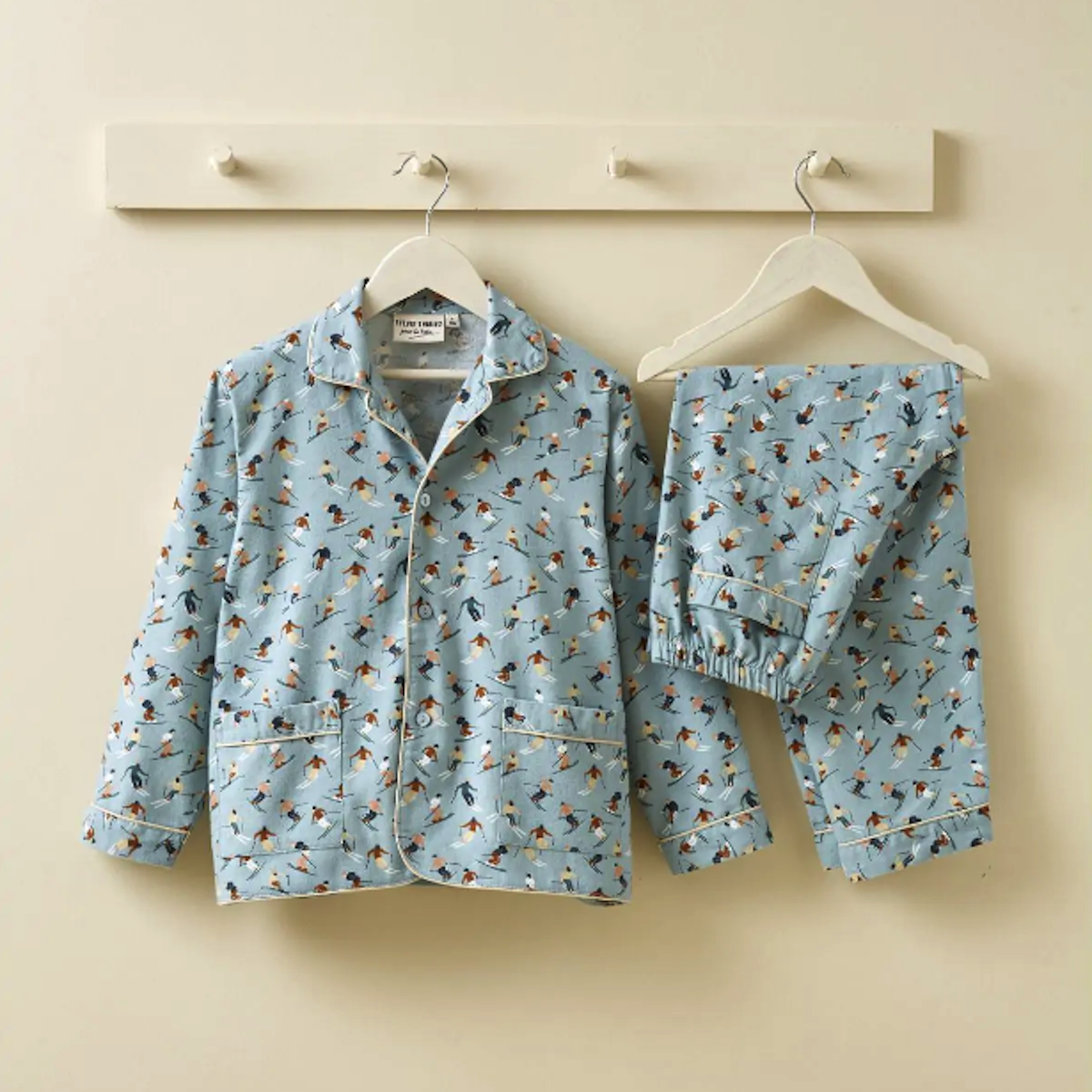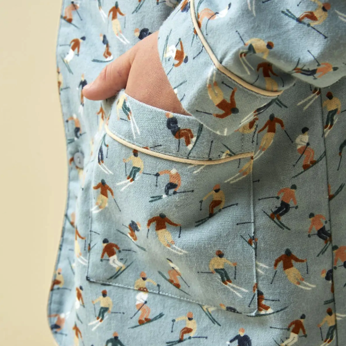 Sur ce pyjamas enfant en flanelle doux et chaud, les silhouettes de skieurs dévalent les pentes dans un motif graphique inspiré des croquis rapides des illustrateurs.