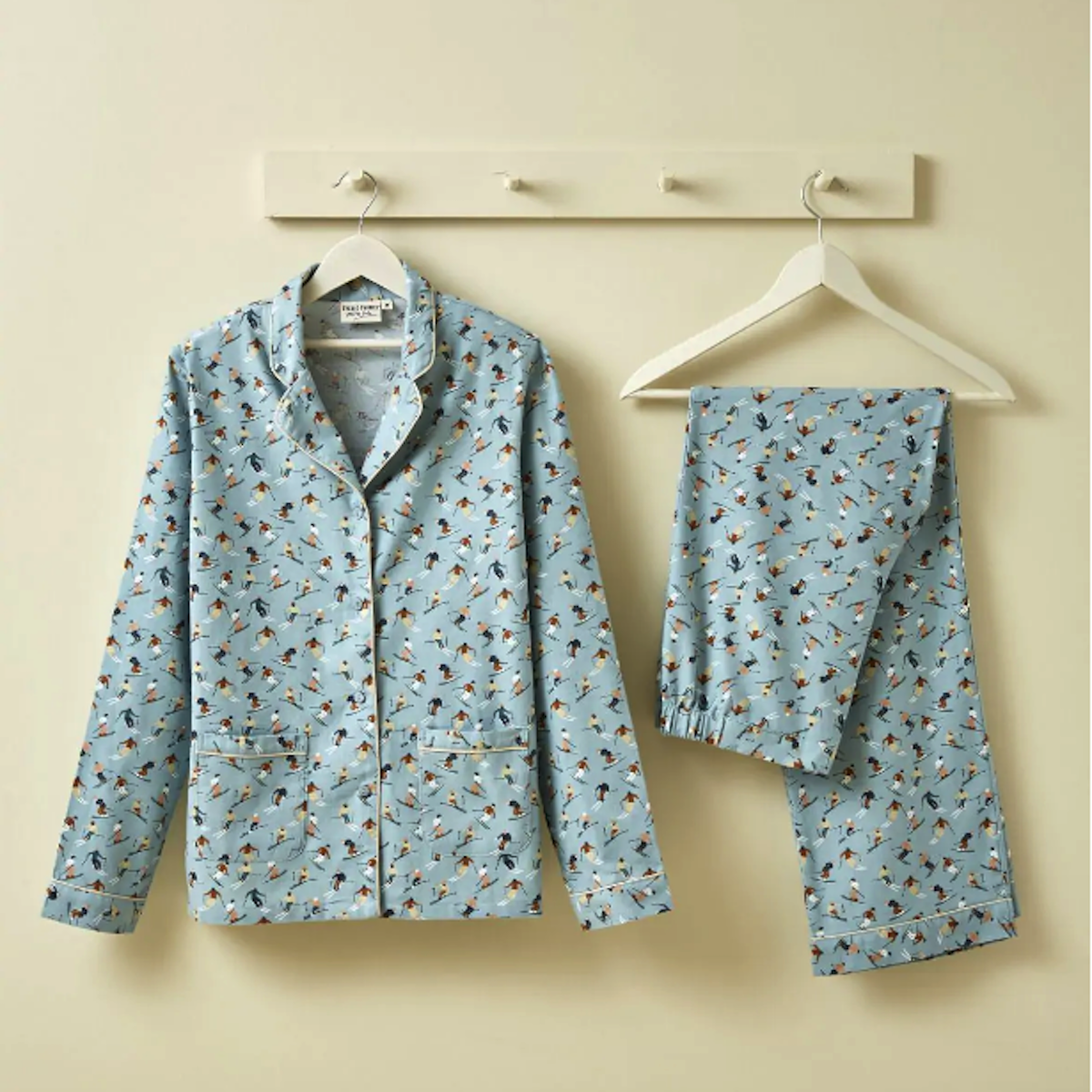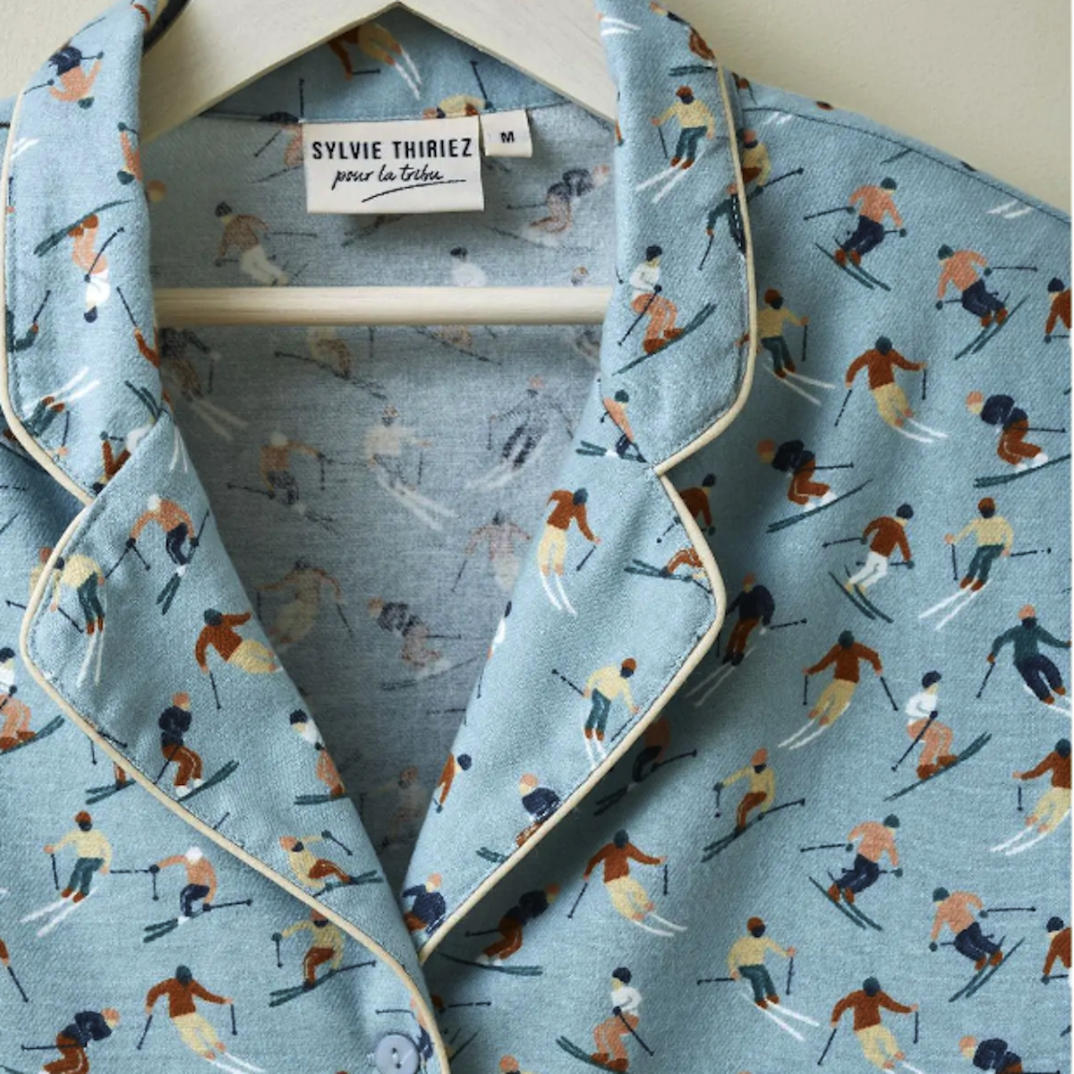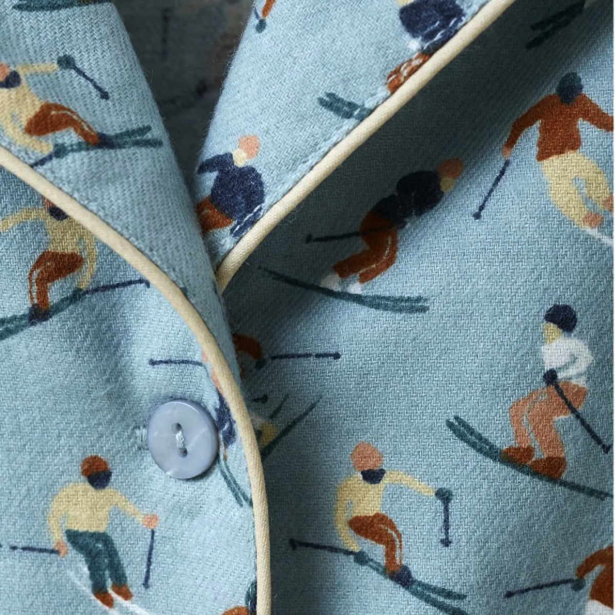 Sur ce pyjama adulte en flanelle doux et chaud, les silhouettes de skieurs dévalent les pentes dans un motif graphique inspiré des croquis rapides des illustrateurs.
