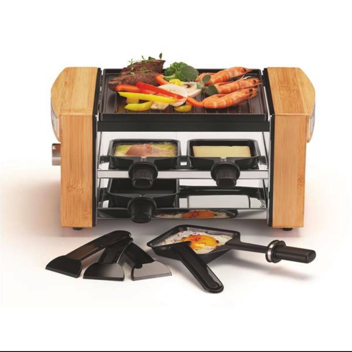 Redécouvrez l'art de la raclette avec élégance grâce à cet appareil au design raffiné qui allie esthétique contemporaine et performance culinaire. Ses flancs en bambou naturel apportent une touche d'authenticité et de chaleur à votre table, tandis que sa structure compacte en fait le compagnon idéal des repas conviviaux en petit comité. Conçu pour 4 personnes, cet appareil transforme chaque dîner en moment privilégié de partage et de gastronomie.Le cœur de l'appareil révèle une ingénieuse combinaison de fonctionnalités : une plaque grill nervurée supérieure pour saisir viandes, légumes et accompagnements avec de parfaites marques de cuisson, et 4 poêlons individuels positionnés en façade permettant à chaque convive de faire fondre son fromage selon ses préférences. La fonte d'aluminium à revêtement antiadhésif garantit une cuisson saine et homogène tout en facilitant considérablement l'entretien. Le système de chauffe électrique assure une montée en température rapide et une chaleur constante durant tout le repas.Ce qui distingue véritablement cet appareil, c'est son équilibre parfait entre fonctionnalité et esthétique. Le bambou, matériau noble et durable, confère une présence visuelle élégante qui s'intègre harmonieusement dans les intérieurs modernes comme traditionnels. Le bouton de contrôle intégré discrètement dans la structure bois permet un réglage précis de la température. Compact sans être limité, cet appareil offre une surface de cuisson généreuse tout en préservant l'espace sur votre table. Les spatules fournies complètent l'ensemble pour une expérience raclette clé en main.