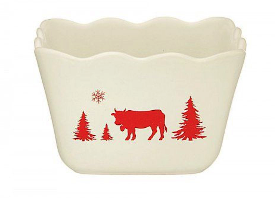 Ramequin en grés blanc mat, orné d'une frise alpestre rouge.