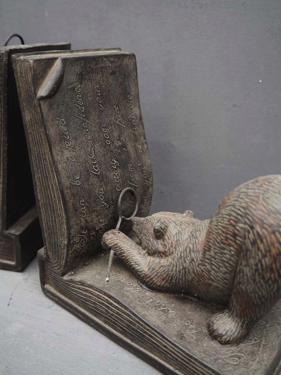 Ces deux adorables ours munis de leurs loupes mènent l’enquête dans votre bibliothèque, vos étagères, ou un buffet et seront très utiles pour caler vos romans préférés.