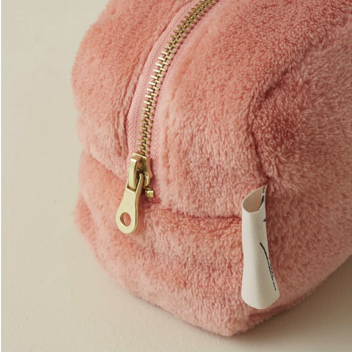 Trousse en polaire velours rose, équipée d’une fermeture éclair et d’une anse.