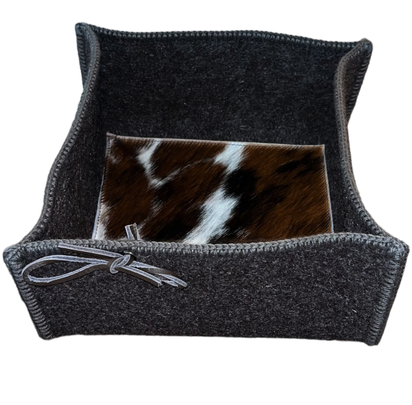Cet élégant vide-poche est en feutre de laine naturelle et peau de vache par Catia Luca, il s'avérera très utile sur un meuble d'entrée, un buffet, un bureau ou une table basse.